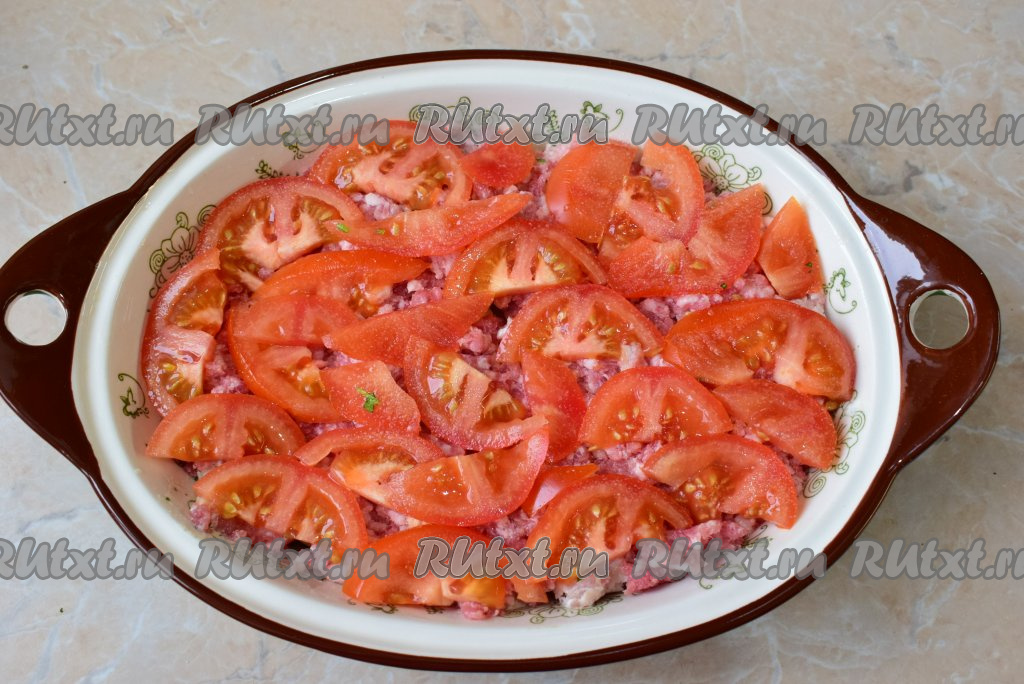 Помидоры помойте, разрежьте на две части и удалите плодоножки. Нарежьте помидоры тонкими ломтиками и выложите по всей поверхности мясного фарша. Немного посыпьте солью.