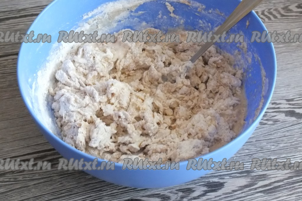 Сначала перемешивайте ложкой, как только тесто начнёт собираться в комочки, месите руками, подсыпая оставшуюся муку.
