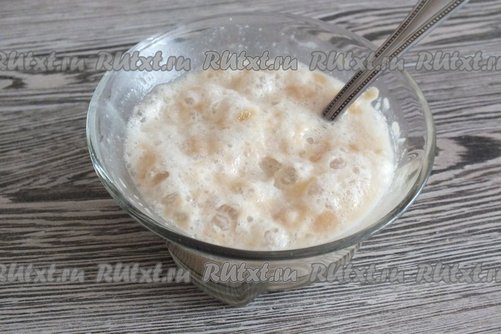 По истечении времени дрожжевая смесь начнёт активно пениться. Можно приступать к замесу теста.