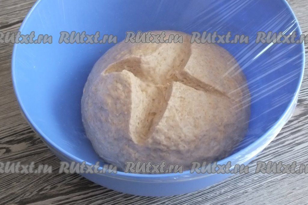 На тесте сделайте крестообразный разрез. Миску с тестом затяните пищевой плёнкой и поставьте в тёплое, без сквозняков место, примерно, на 1 час 15 минут.