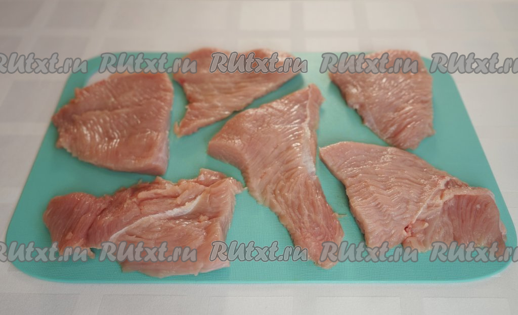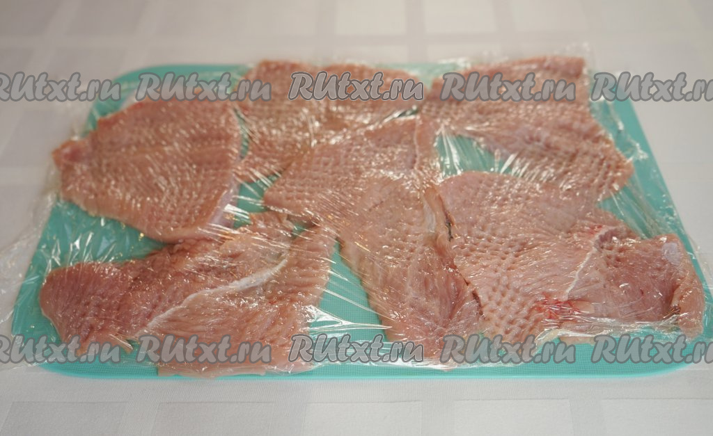 Начинаем приготовление отбивных с того, что моем, а затем просушиваем бумажными полотенцами филе индейки. Далее нарезаем его на кусочки толщиной 0,7 см - 1 см.