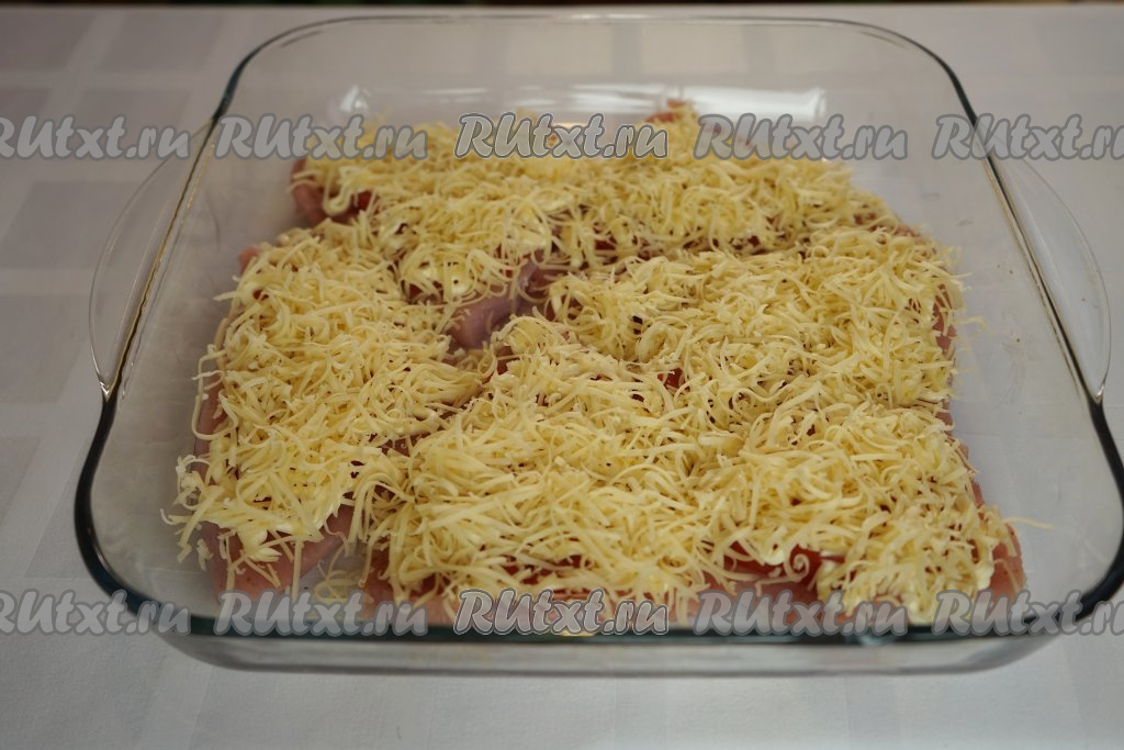 Наши отбивные из индейки с помидорами щедро присыпаем натёртым сыром и отправляем в разогретую до 180 градусов духовку на 20-25 минут.