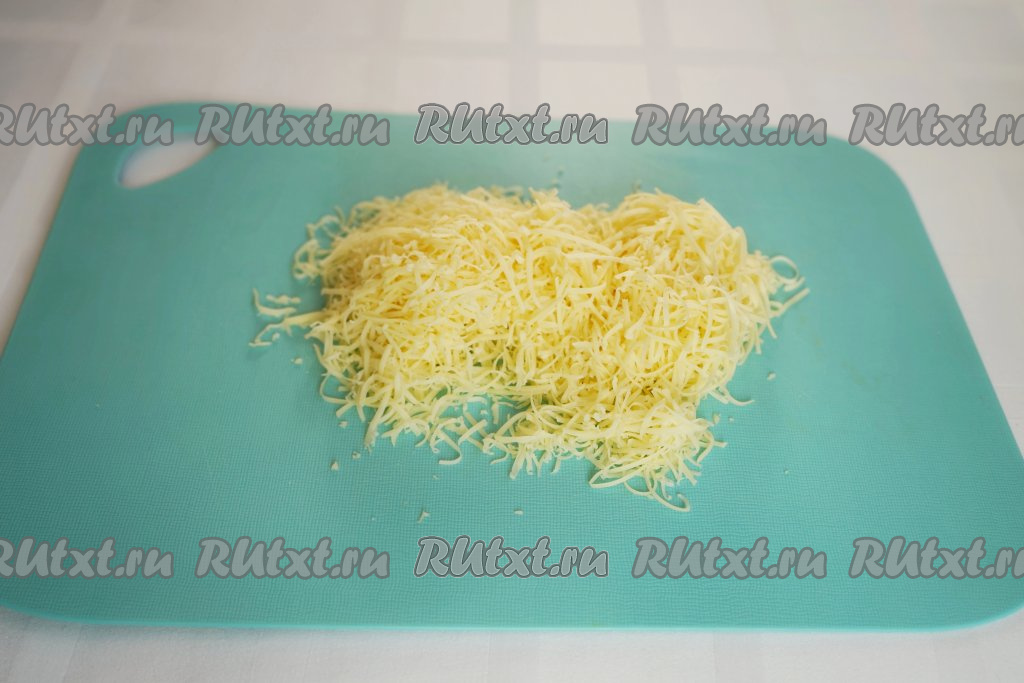 Далее натираем на средней терке 100 грамм твёрдого сыра. Для запекания лучше всего подойдут, например, «Гауда» или «Голландский» - они отлично плавятся. Но в целом, это дело вкуса, какой предпочитаете сыр, тот и берите.