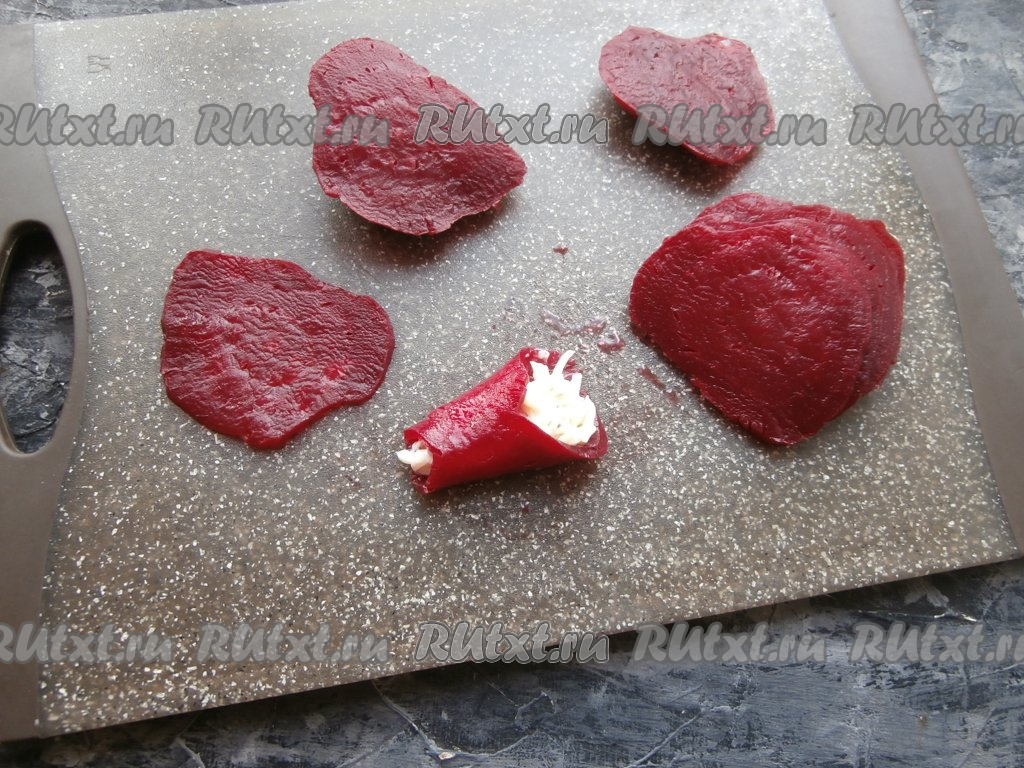 Свернуть свеклу кулёчком (как на фото). Если свекла будет плохо держаться, зафиксировать шпажками или зубочистками. Аналогично сформировать все "кулёчки".