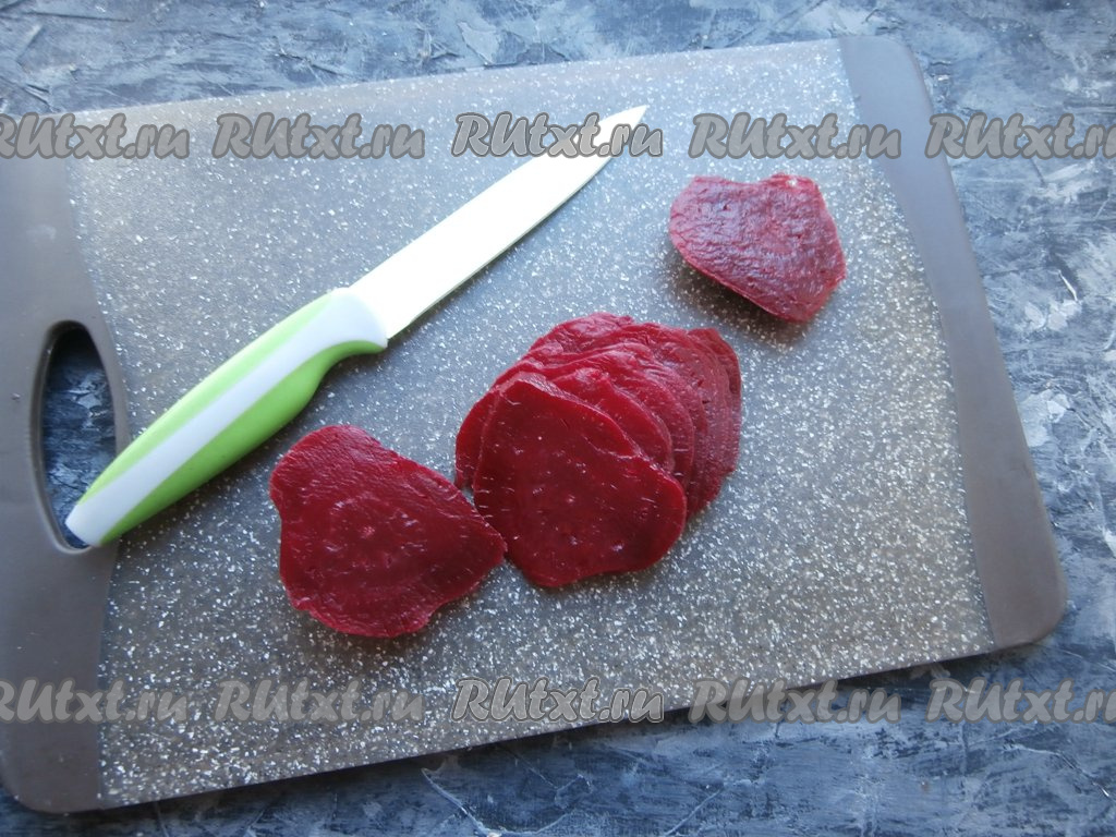 Свеклу нужно отварить в кипящей воде около 1 часа, остудить и очистить. Нарезать её острым ножом на тонкие кружки-ломтики.