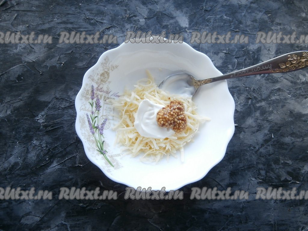 Сыр натереть на средней (или мелкой) тёрке, добавить сметану и французскую горчицу. Сюда же добавить пропущенный через пресс чеснок и немного соли, перемешать сырную начинку.