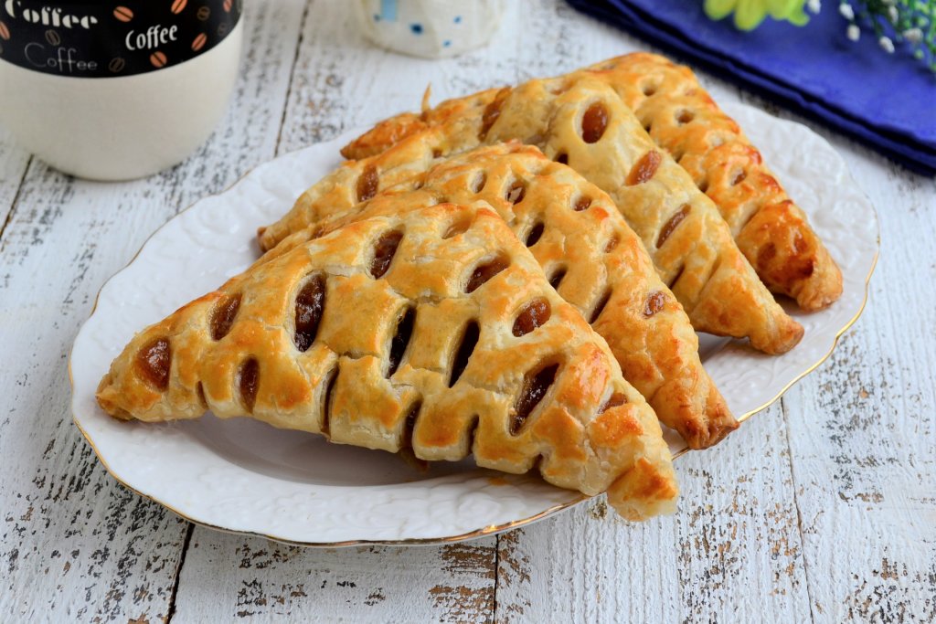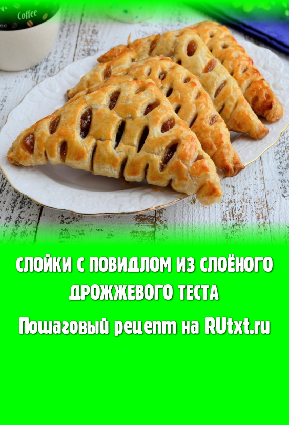 Очень вкусные, быстрые в приготовлении, аппетитные слойки с повидлом, испечённые из слоёного дрожжевого теста, остудить и можно подавать в качестве дополнения к чашечке кофе или чая.