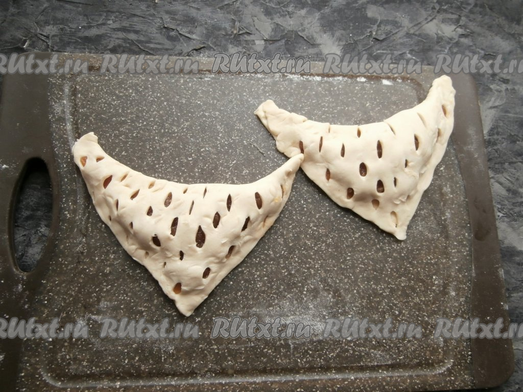 Края теста смазать яичным белком. Часть угла теста с повидлом накрыть частью с разрезами, края прижать, чтобы они основательно скрепились.