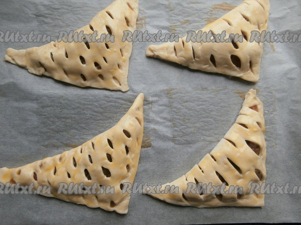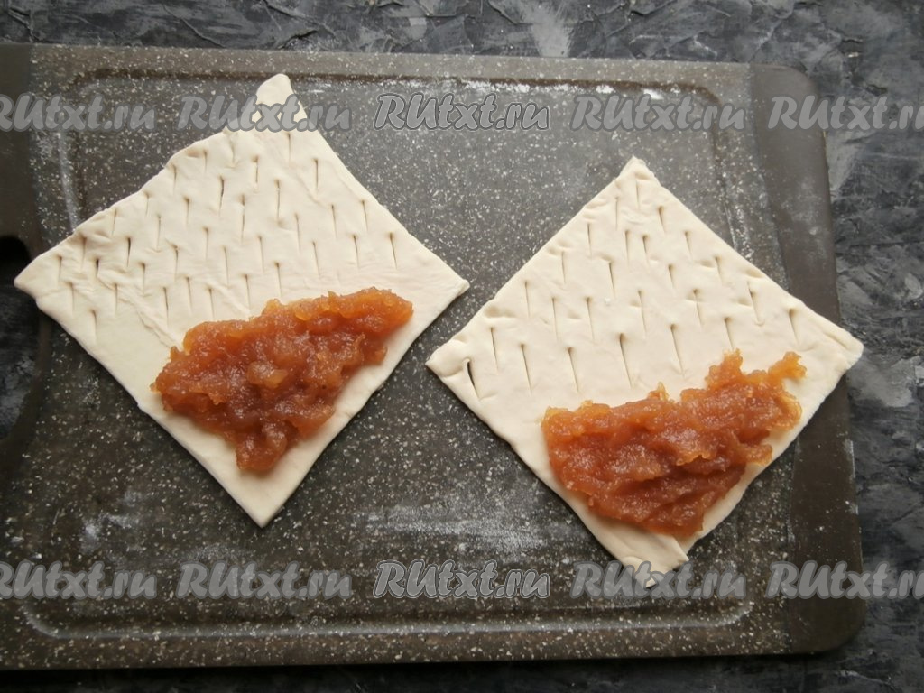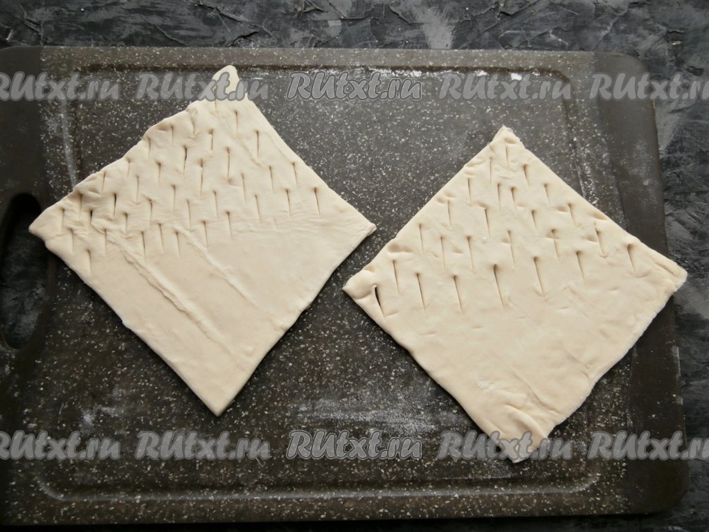 Слоёное тесто немного разморозить, на поверхности, припылённой мукой, разрезать на квадраты размером 13 см х 13 см (у меня получилось 4 квадрата). Взять один квадрат, в противоположной стороне от одного угла острым ножом сделать небольшие разрезы в хаотичном (или чётком) порядке. Разрезы делать до середины квадрата, оставляя другую часть в первоначальном виде (см. фото).