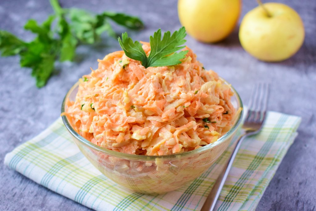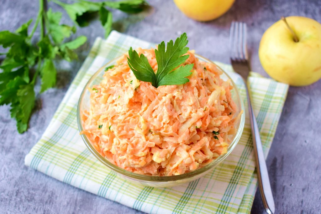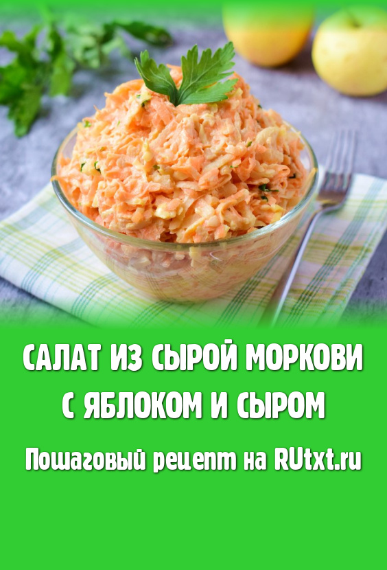 Салат, приготовленный из сырой моркови с добавлением яблока и сыра, очень популярен. И не зря! Ведь он очень вкусный, лёгкий и сочный! Я заправила этот салатик майонезом, при желании его можно заменить на сметану или домашний соус. Делюсь с вами рецептом простого салата из доступных ингредиентов!