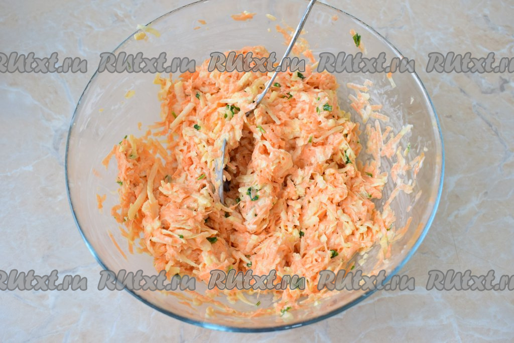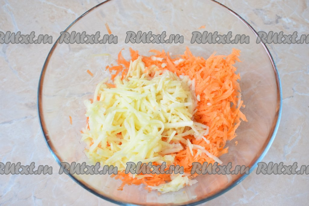 Натрите на средней тёрке морковь и выложите в достаточно глубокую миску. Следом натрите на крупной тёрке очищенные яблоки и добавьте к морковке. Натёртые яблоки сбрызните соком лимона, чтобы они не потемнели.