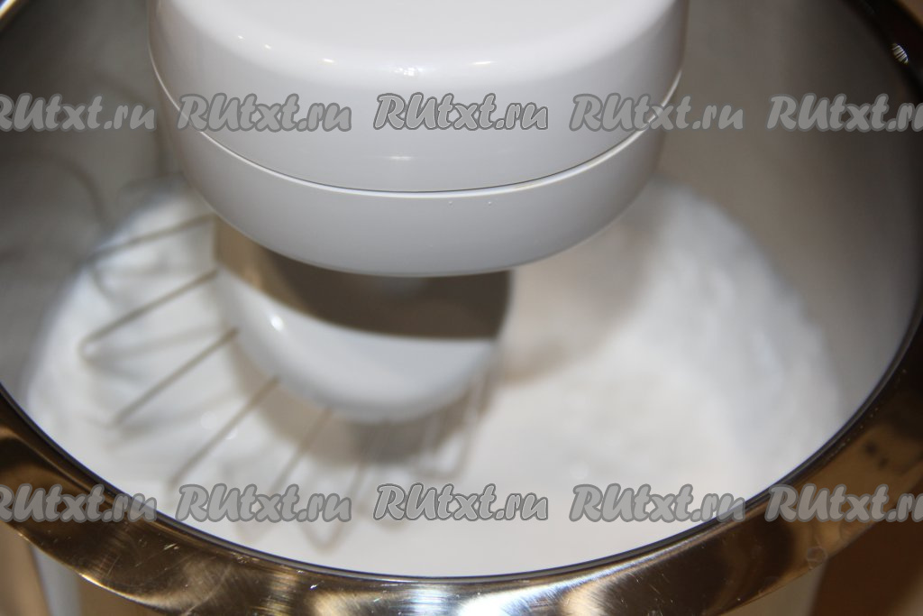 Сливки перед взбиванием хорошо охладить. Влить хорошо охлаждённые сливки жирностью 33% в чашу для взбивания, немного взбить миксером, затем, подсыпая сахарную пудру, взбить их до стойких пиков (я использовала сливки на растительных маслах, в их состав уже входит сахар, поэтому я взбивала охлаждённые сливки без добавления сахара).