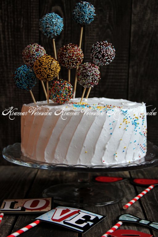 Достать торт и покрыть отложенными сливками, с помощью шпателя сформировать волны. Можно украсить цветной посыпкой (я украсила ещё кейк-попсами).