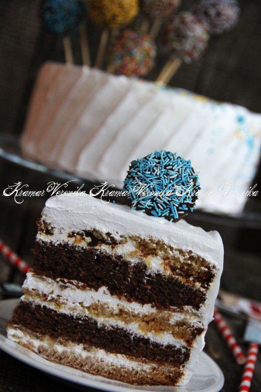 Хочу поделиться рецептом бисквитного торта со взбитыми сливками. Такой тортик можно приготовить на праздничный стол. Его основу составляют ванильный и шоколадный бисквиты, разрезанные на коржи и промазанные взбитыми сливками. Для приготовления крема можно использовать сливки жирностью 33%, взбитые с сахарной пудрой (или же сливки жирностью 26% на растительных маслах, они уже сладкие, поэтому сахар можно не добавлять). Я ещё на каждый корж выложила кусочки банана. Благодаря отличному сочетанию бисквитов и взбитых сливок, торт получился очень вкусным, нежным, эффектным. Украсить его можно на своё усмотрение (я украсила кейк-попсами и кондитерской посыпкой). Торт получается большим (диаметром 28 см).