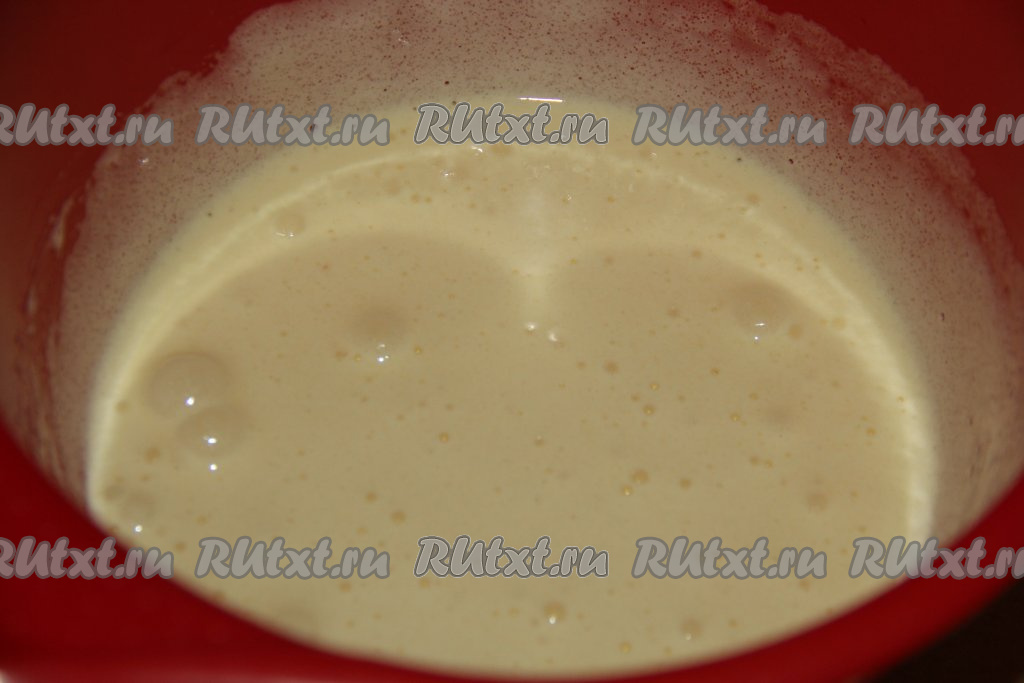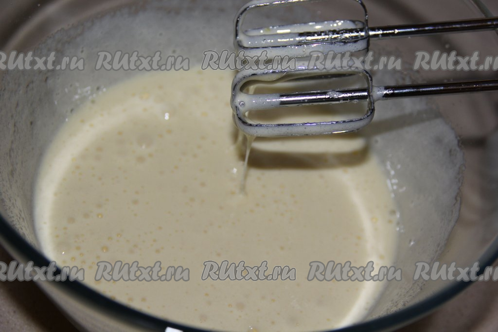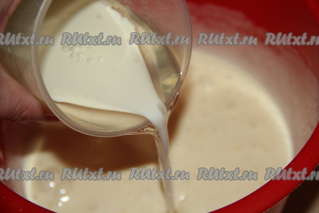 После этого соединить молоко и растительное масло, перемешать и влить в смесь яиц и сахара, перемешать миксером массу в течение 1 минуты.
