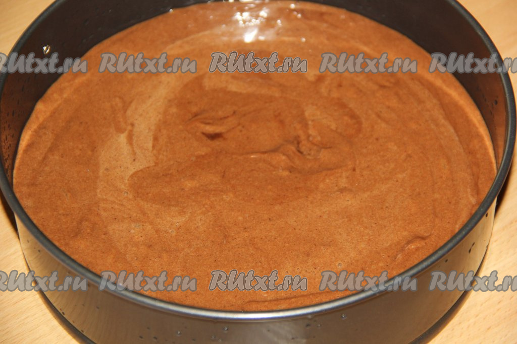 Тесто получится как сметана средней густоты. Выложить тесто в разъёмную форму диаметром 28 сантиметров, дно которой застелено пергаментом, а бока смазаны растительным маслом.