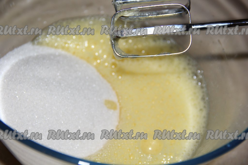 В пышную яичную массу всыпать сахар и взбивать ещё 5 минут на максимальной скорости миксера.