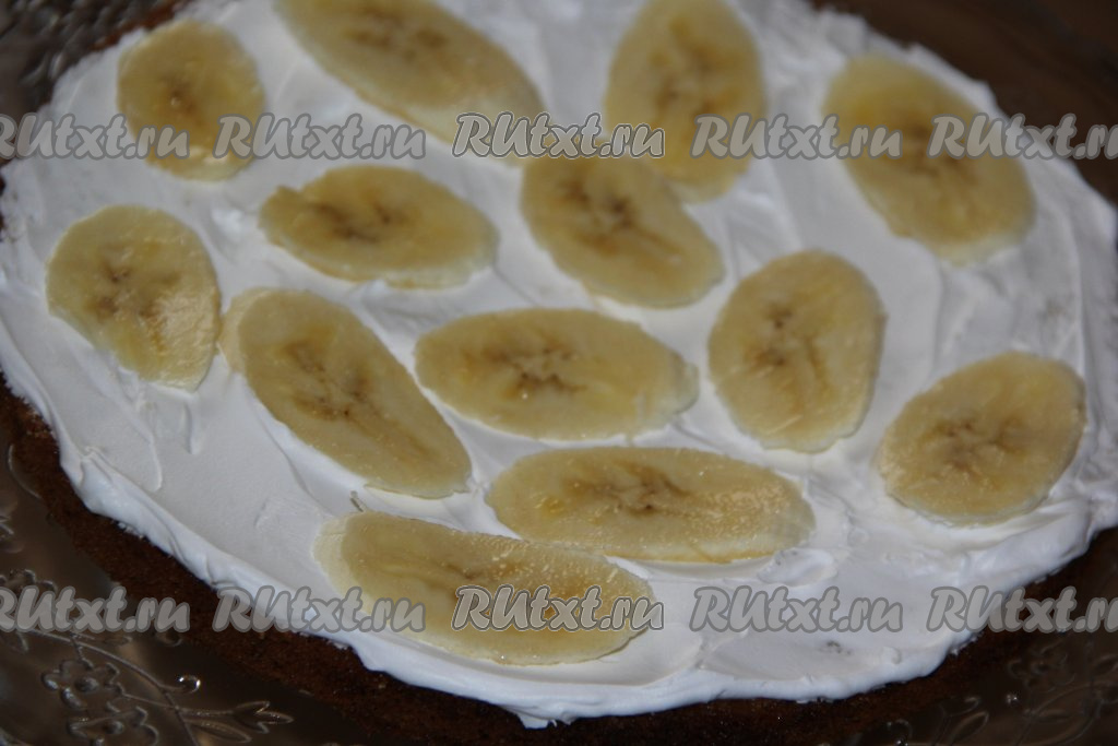 Теперь можно приступать к сборке торта. Бананы очистить, нарезать на достаточно тонкие кружочки. Взять первый ванильный корж, пропитать его любым сиропом (я пропитываю ванильным сиропом, который используется для приготовления кофе), смазать взбитыми сливками, выложить кружочки банана, затем сверху выложить шоколадный корж, тоже пропитать сиропом, смазать взбитыми сливками, разложить кружочки банана, выложить ванильный корж. Таким образом, чередуя коржи, пропитывая их, смазывая взбитыми сливками и прокладывая бананами, собрать весь торт.