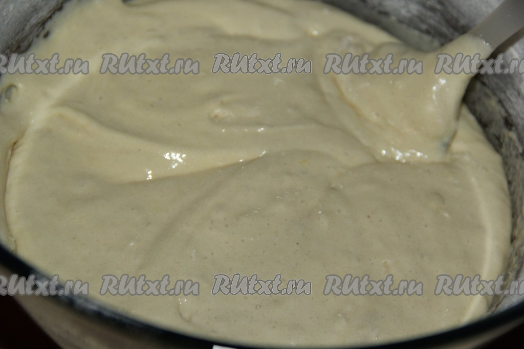Перемешивать тесто лопаткой движениями сверху вниз. Постепенно подсыпая оставшуюся муку, замесить воздушное тесто, напоминающее в меру густую сметану.