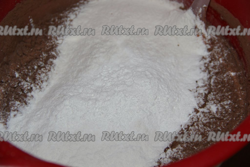 Вмешать какао на низкой скорости миксера, затем всыпать весь разрыхлитель и выложить половину просеянной муки.