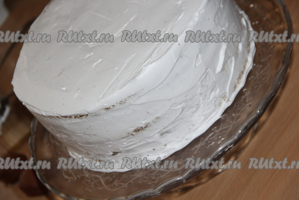 Верх и бока бисквитного торта тоже смазать взбитыми сливками и поставить в холодильник на ночь. Немного взбитых сливок у меня осталось для украшения торта, я поставила их в холодильник.