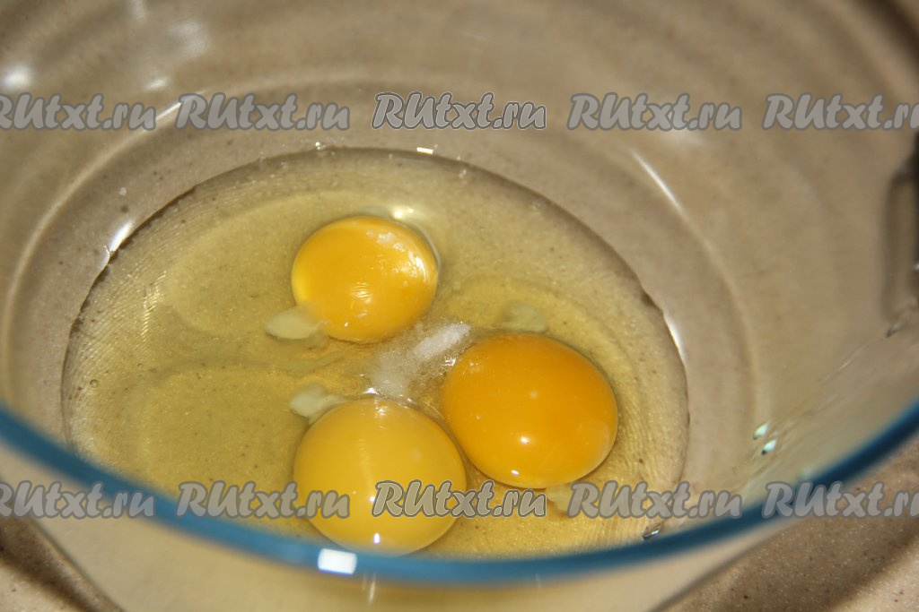 Вначале приготовим ванильный бисквит, для этого в миску нужно разбить яйца, взбить их миксером до пышного состояния в течение 2 минут.