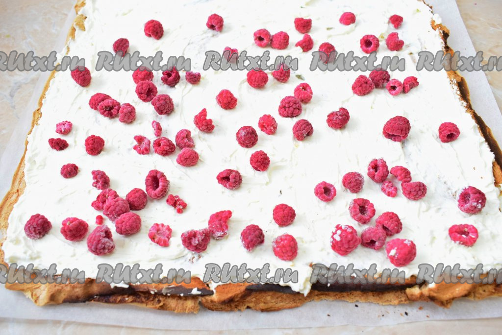 Кремом, приготовленным из творожного сыра и сливок, смажьте остывший меренговый корж (часть крема оставьте для украшения). Замороженные ягоды немного разморозьте, лишний сок слейте. Выложите равномерно ягоды поверх крема (немного ягод оставьте для украшения).