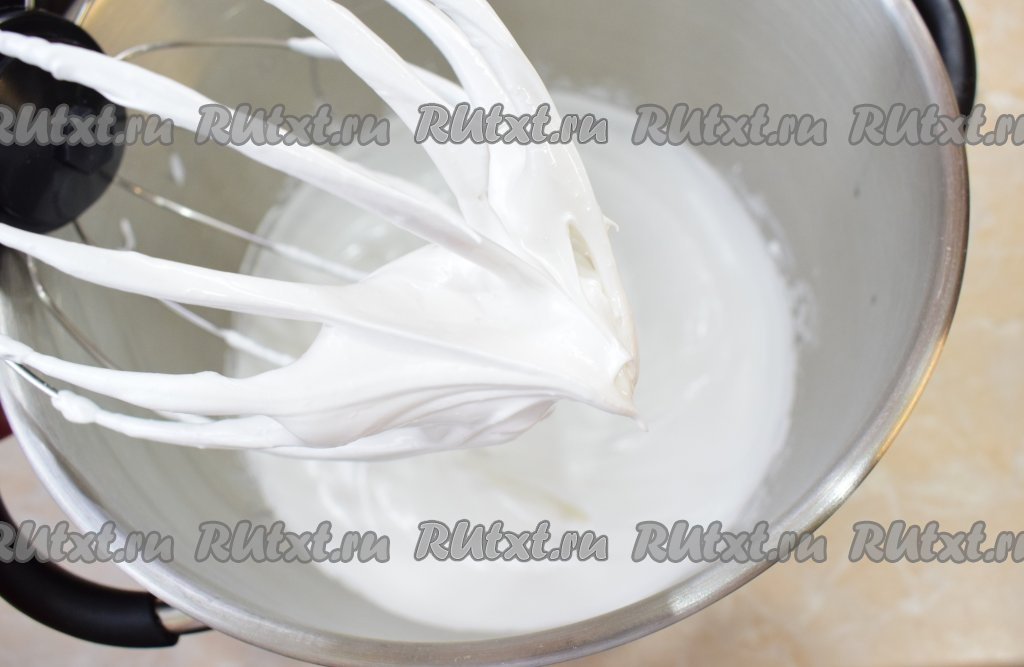 После добавления пудры влейте лимонный сок. Взбивайте белки на максимальной скорости миксера 3-5 минут (до твёрдых пиков). Взбитые белки должны держать форму, быть пышными, плотными. Всыпьте крахмал, перемешайте на низкой скорости миксера до однородности (долго перемешивать не нужно, буквально в течение нескольких секунд).