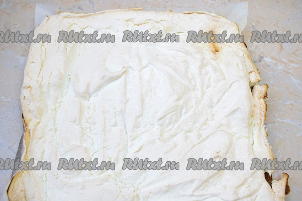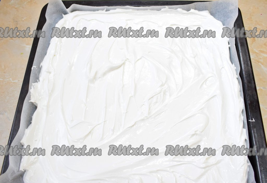Противень для выпечки (у меня размер 40 см х 40 см) застелите пергаментом. Пергамент нужен хорошего качества, тогда меренга не пристанет к бумаге в процессе выпечки, идеально подойдёт силиконизированная бумага для выпечки (она продаётся во многих супермаркетах, а о том что она силиконизирована, указано на упаковке). Равномерно распределите по пергаменту всю белковую массу.