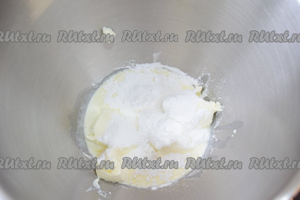 Для приготовления крема соедините охлаждённые жирные сливки, творожный сыр и сахарную пудру.