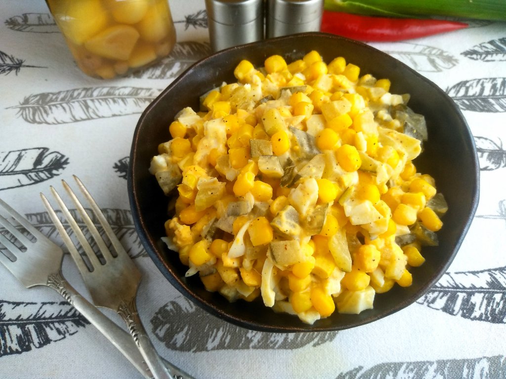 Для всех тех, кто любит быстрые рецепты, предлагаю приготовить буквально за 10-15 минут салат из простых ингредиентов: яиц, консервированной кукурузы и солёных огурчиков. Блюдо получается вкусным, сытным. Для этого рецепта я советую брать майонез с классическим вкусом и с жирностью не менее 60%. Уверена, этот простой салатик понравится многим и отлично впишется в семейное меню!
