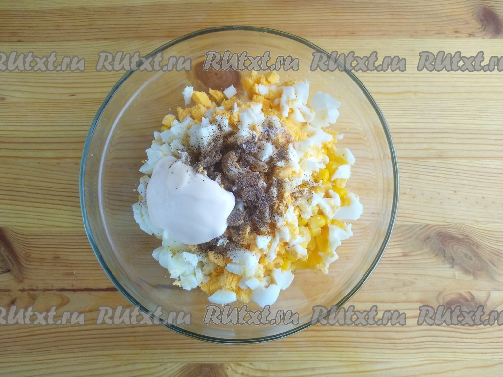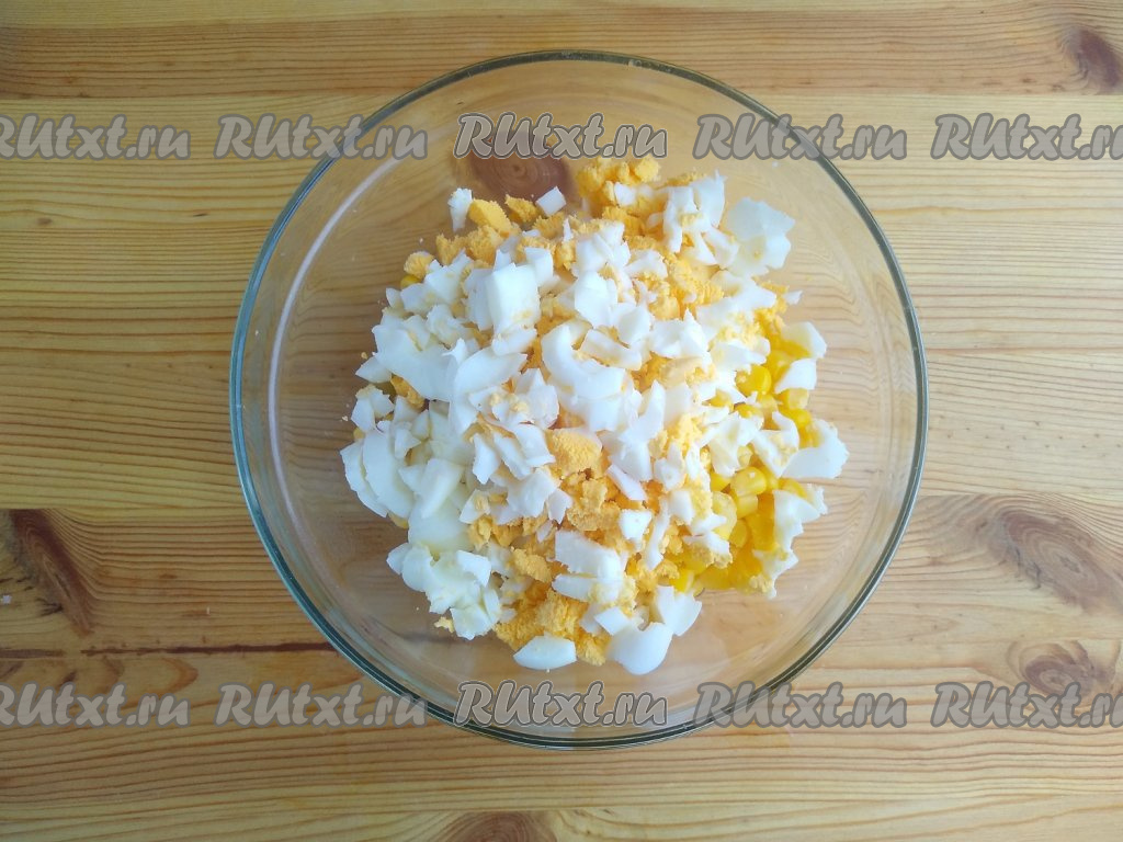 Яйца выложить в кастрюлю с холодной водой, варить на медленном огне в течение 7-8 минут с момента закипания. Затем охладить яйца, залив их холодной водой, а после этого очистить от скорлупы и нарезать мелко. Добавить нарезанные яйца в салат.
