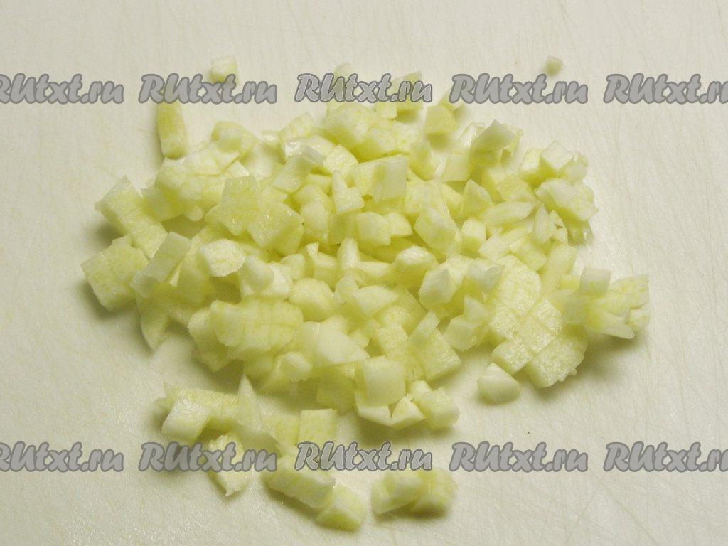 Очищенные от шелухи зубчики чеснока нарезаем маленькими кубиками.
