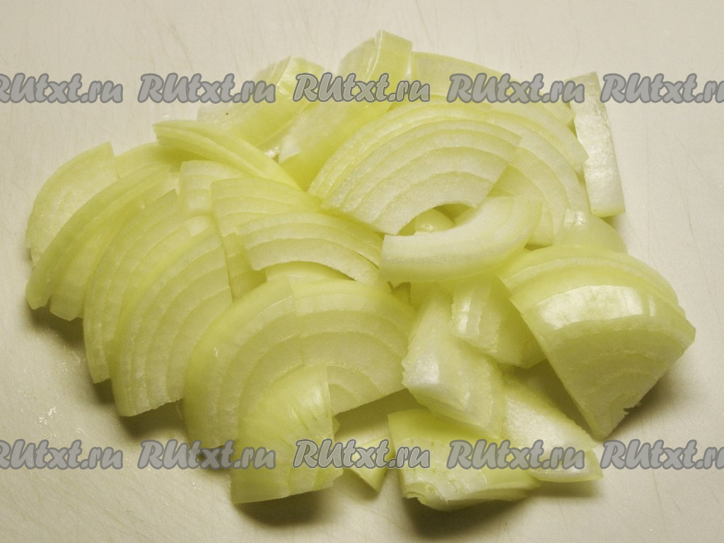 Пока готовятся макароны, займёмся обжариванием лука с чесноком. Луковицу чистим и нарезаем полукольцами (или четверть кольцами).