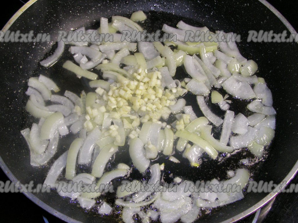 На другой сковороде на подсолнечном масле на среднем огне обжариваем лук вместе с чесноком, помешивая, в течение 3 минут (до мягкости).