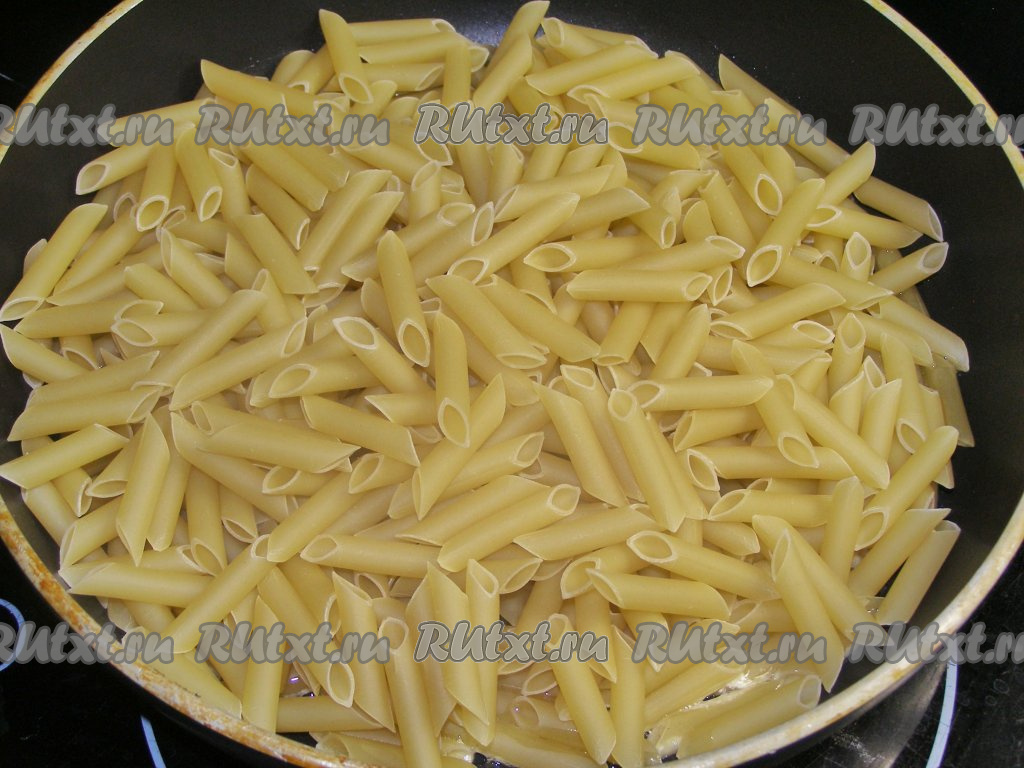В сковородку наливаем, примерно, 1 столовую ложку подсолнечного масла, немного разогреваем на сильном огне и высыпаем в сковороду сухие макароны.