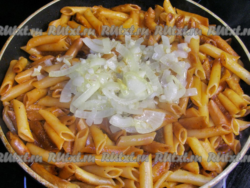 Перекладываем обжаренные лук с чесноком в сковородку с макаронами, перемешиваем, можно немного прогреть всё блюдо и снимаем с огня.