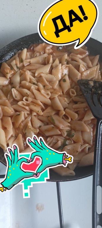 Добавляем в сковородку к макаронам томатную пасту и сразу перемешиваем.