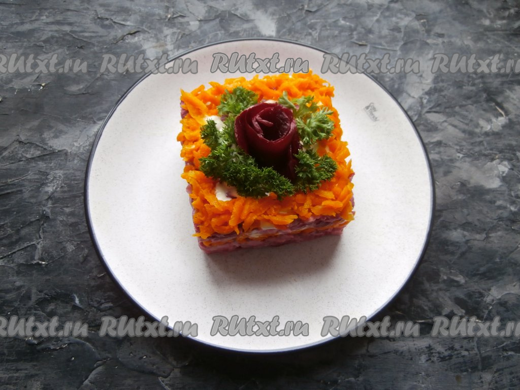 Сверху выложить оставшуюся натёртую морковь (морковку можно выложить ровным слоем или покрыть ею края салата). Украсить салат можно розочкой из свеклы и зеленью.