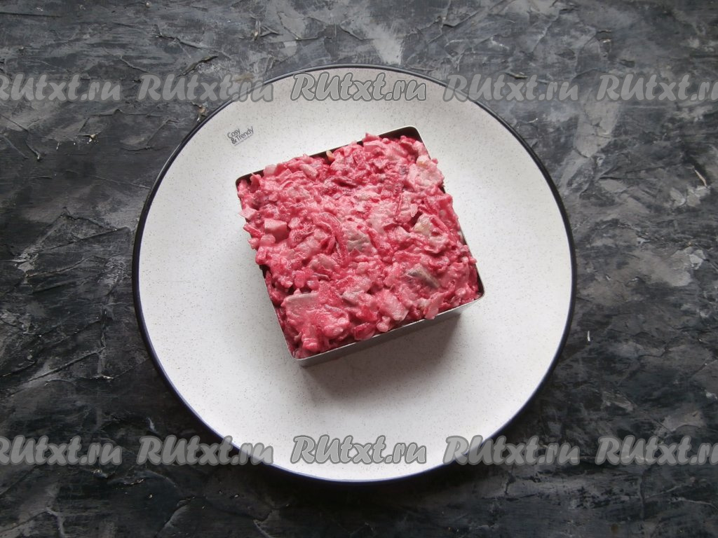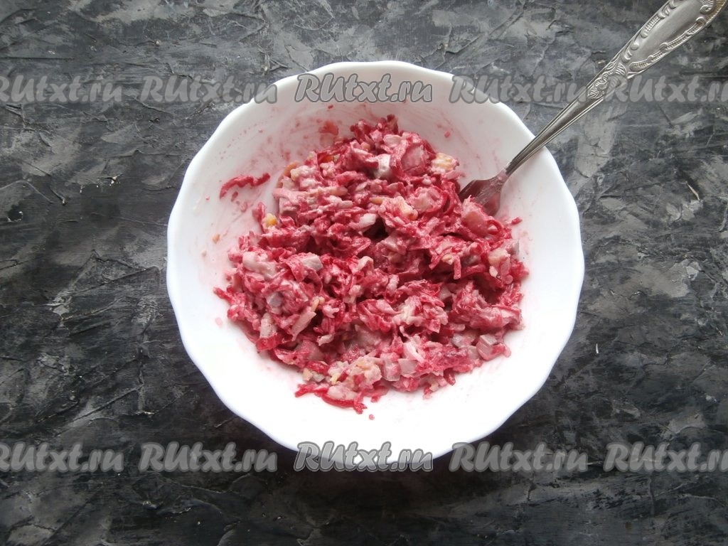 Далее добавить натёртую на крупной тёрке свеклу и майонез, немного посолить и поперчить.