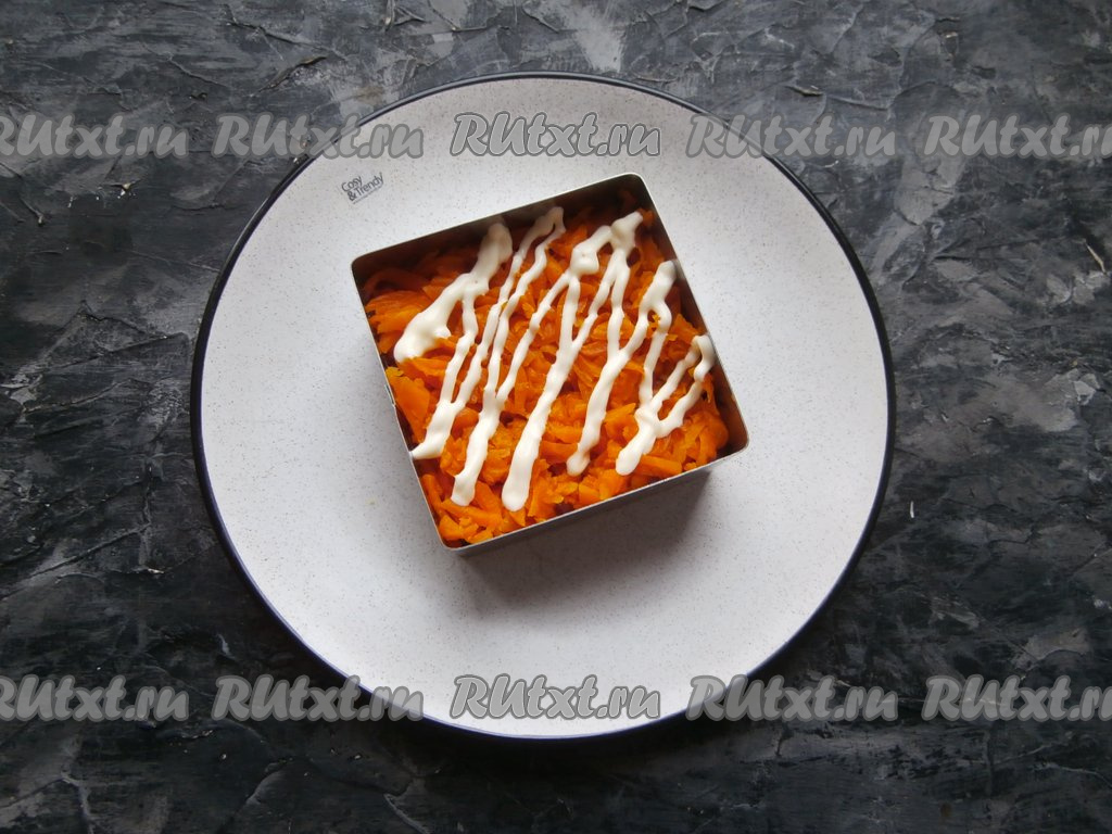 Морковку натереть на крупной тёрке и половину выложить в формочку ровным слоем, смазать немного майонезом.