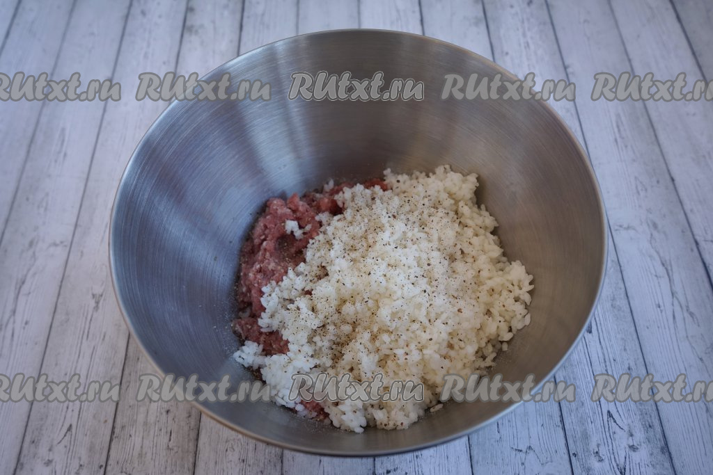 Соединяем рис и 700 грамм мясного фарша (я беру свино-говяжий, но отлично подойдёт и любой другой мясной фарш), солим, приправляем специями по вкусу. Тщательно перемешиваем фарш с рисом.