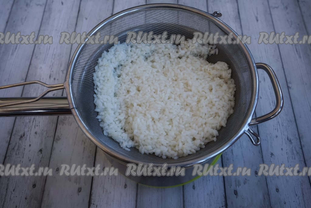 Отваренный до полуготовности рис откидываем на дуршлаг (или мелкое сито), промываем под проточной холодной водой, даём стечь воде.