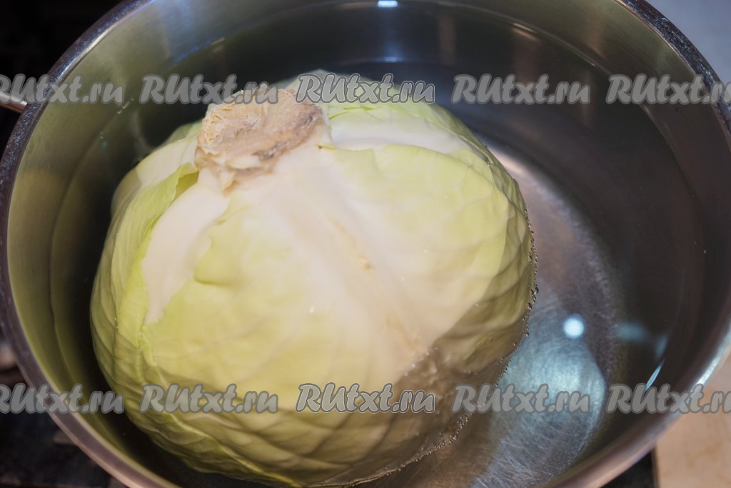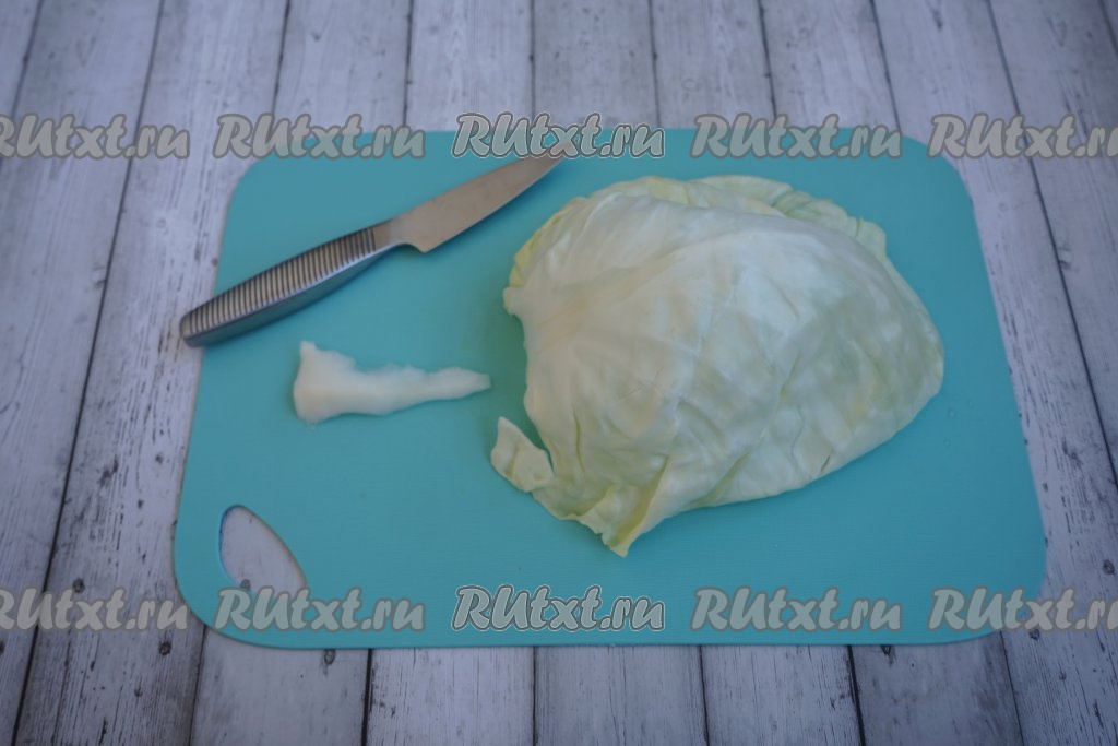 Вынимаем первые листочки, а следующие также надрезаем у основания. Аккуратно, не обожгитесь! Таким образом отделяем от кочана необходимое количество капустных листьев. На это количество фарша нужно будет 10-12 крупных листочков капусты.