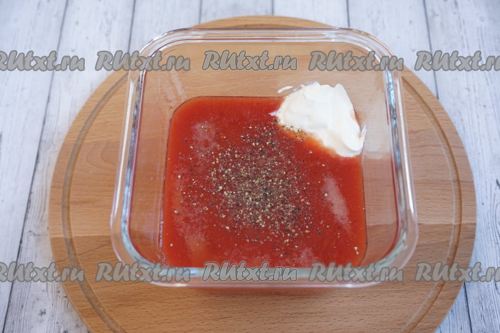 Теперь пришла пора заняться томатно-сметанным соусом. Выбираем подходящую ёмкость и наливаем туда 600 мл воды. Размешиваем в ней 4 столовые ложки томатной пасты. Если паста жидкая, можно взять и больше. Дальше добавляем 2 столовые ложки сметаны, солим, добавляем специи по вкусу и перемешиваем томатно-сметанный соус.