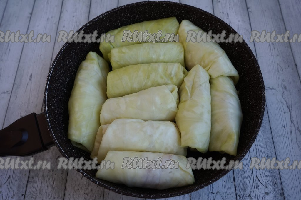 Выкладываем наши голубцы в глубокую сковороду, между ними кладём лавровый лист и пару горошинок перца. Смазывать дно сковороды маслом необязательно, так как мы будем тушить наше блюдо - ко дну ничего не пригорит.