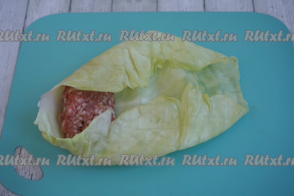 Начинаем формировать наши голубцы. На капустный лист выкладываем небольшой шарик фарша весом, примерно, 100-120 грамм. Фарш кладём ближе к основанию листа, подворачиваем капусту с двух боков (слева и справа от фарша).
