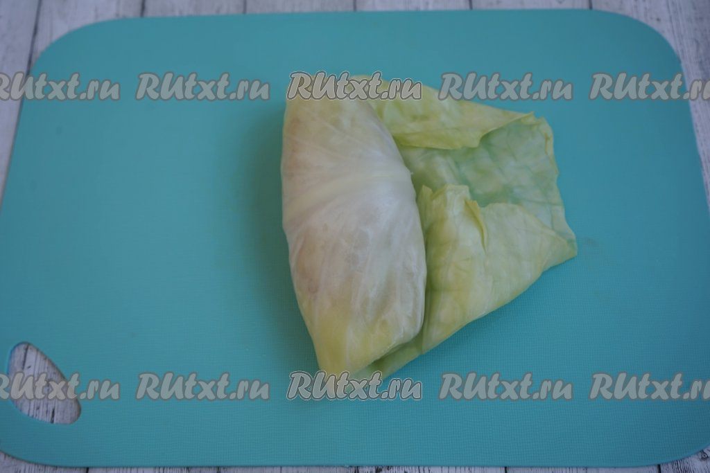 И аккуратно сворачиваем, начиная со стороны с фаршем, капустный лист в рулетик (как на фото), формируя голубец. Аналогично формируем все голубцы из капустных листьев и фарша.