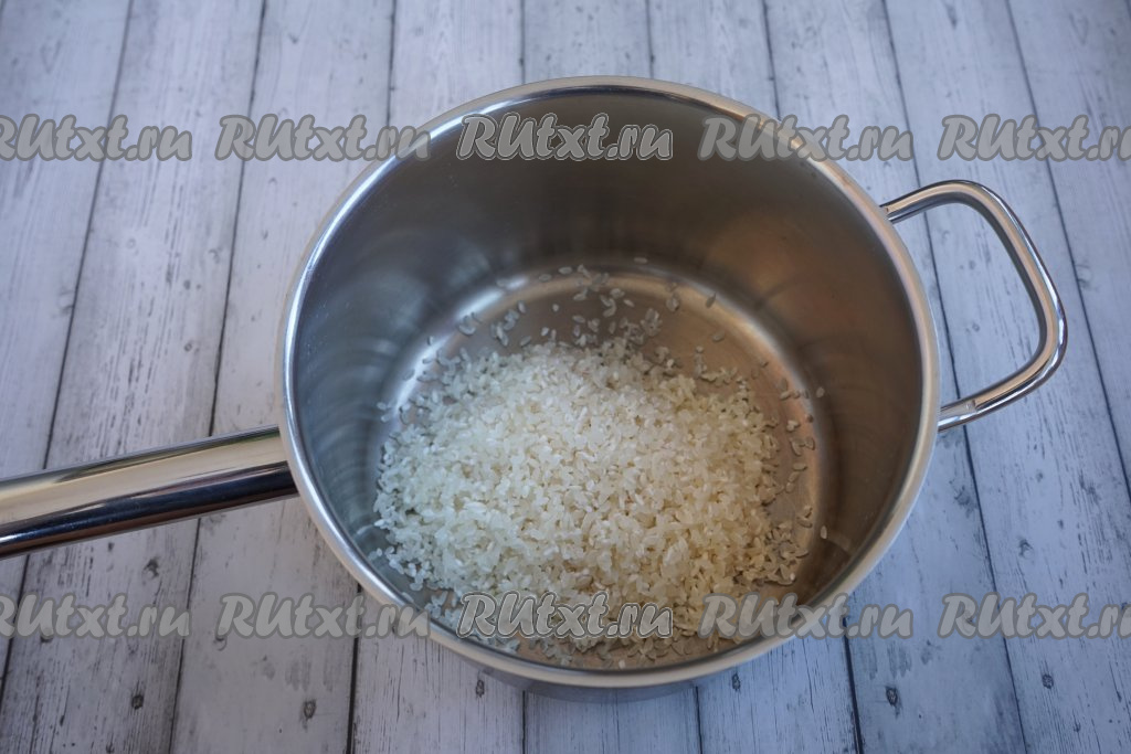 Теперь капустные листья отставляем в сторону и начинаем заниматься начинкой. Тщательно промываем 200 грамм риса. Я обычно беру «Краснодарский», но для голубцов существенной разницы нет, поэтому и любой длиннозёрный отлично подойдёт. Перекладываем промытый под проточной водой рис в сотейник и заливаем 400 мл воды, ставим на огонь, даём воде закипеть и отвариваем рис до полуготовности (примерно, 5-7 минут).