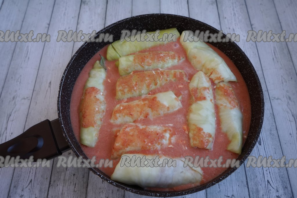 Заливаем наши голубцы получившимся томатно-сметанным соусом, закрываем сковороду крышкой, ставим на огонь, даём закипеть соусу, а затем тушим на небольшом огне 25-30 минут.